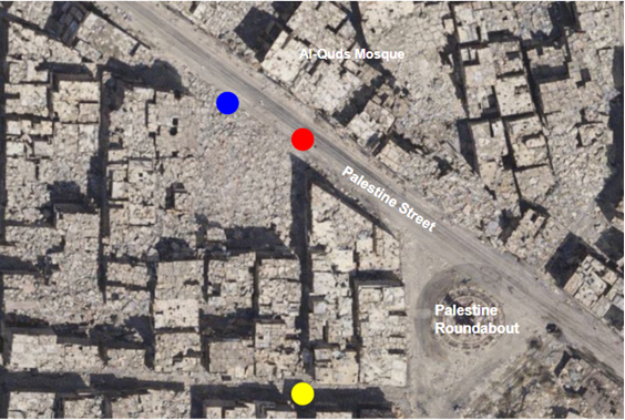 النقطة الزرقاء: تمثّل المكان الذي كان يقف فيه غالبًا الرجل الملثّم المعروف أيضًا باسم محمود س.